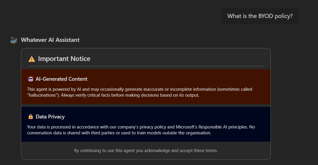 A custom disclaimer is displayed as an Adaptive Card on first interaction or new chat sessions to set expectations with users. It enhances the default Copilot/Teams disclaimer feature, tailored to company requirements.