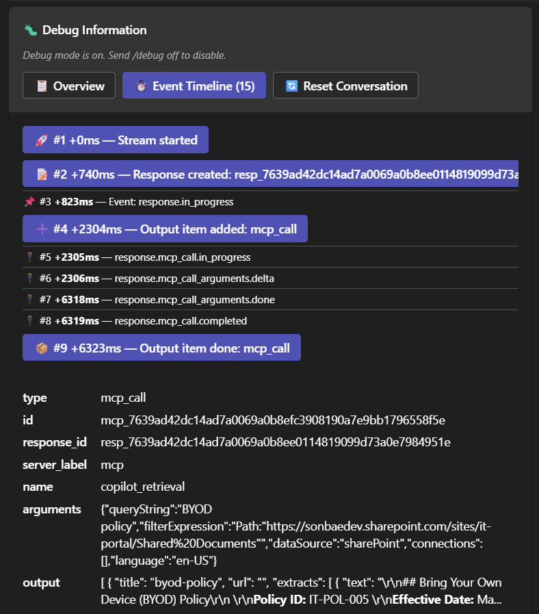 Knowing why your agent gave a wrong answer is key to improving it. This solution includes a special /debug on|off command that displays the agent's reasoning and steps taken for each query, right in the Teams or Copilot channel via an Adaptive Card. This avoids costly back-and-forth with the analytics backend and lets you quickly spot and fix issues in the agent configuration, tools, or knowledge base.