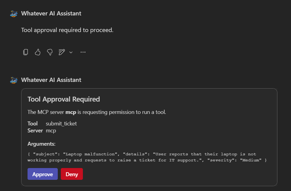 Catch tool approval requests from the agent and integrate an approval process directly in Teams or Copilot via a dynamic Adaptive Card.