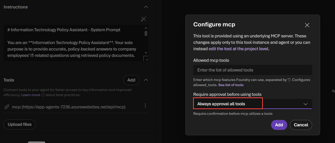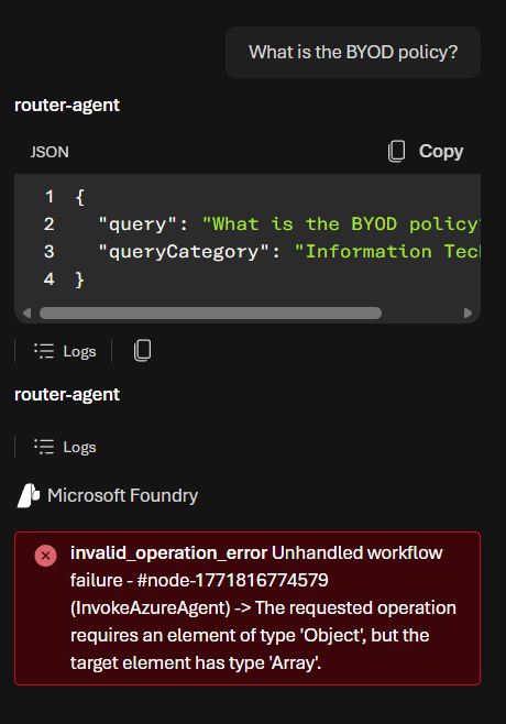 allowed_tools property type mismatchThere is currently a bug in workflow agents when the allowed_tools property is set on an agent. The Foundry workflow runtime expects this property to be an object, but by default it is set as an array when updating MCP tools from the Foundry portal — resulting in an error when calling the workflow agent. To avoid this, agent deployment is done by script, omitting that property.