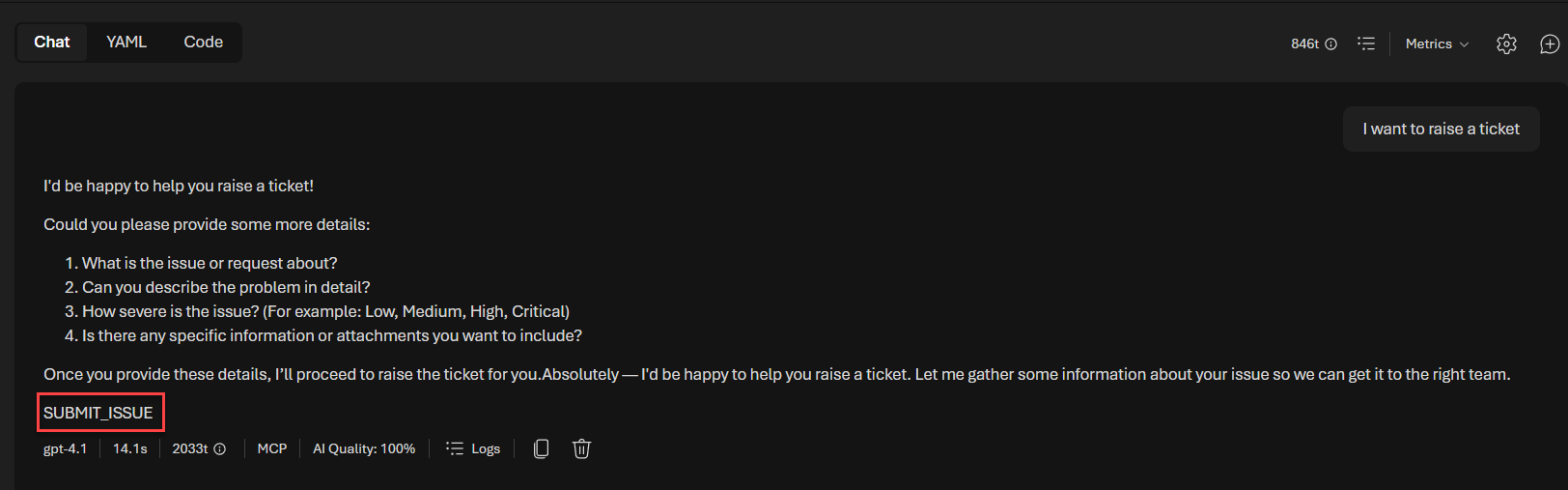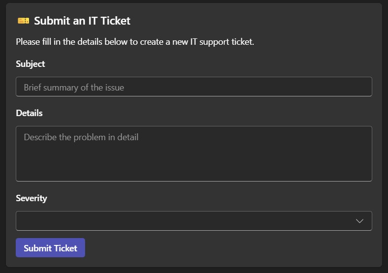When the agent outputs the SUBMIT_ISSUE marker, we intercept it in the streaming response and display the appropriate Adaptive Card form: