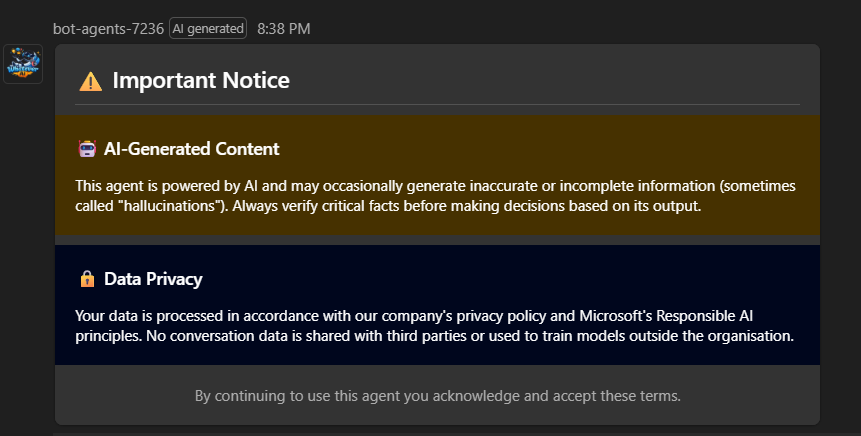 Disclaimer about AI practices is a common business requirement. However, default disclaimer capabilities in Teams and Copilot are quite limited. In our solution, we implemented a dynamic disclaimer mechanism that can be triggered by the agent for every new conversation, displaying an Adaptive Card with the relevant information. This allows for a more flexible and rich disclaimer experience — for instance, adding an "I agree" call to action.