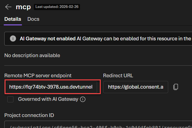 Instead of creating a standalone MCP server, we integrated the MCP server code directly into our agent application as a dedicated route (i.e., /api/mcp). This way, we can leverage the existing Microsoft 365 Agents Toolkit dev tunnels feature to expose our local environment to the internet and test our agents seamlessly — without having to spin up multiple applications. This also provides a more integrated debugging experience with breakpoints in a single place.